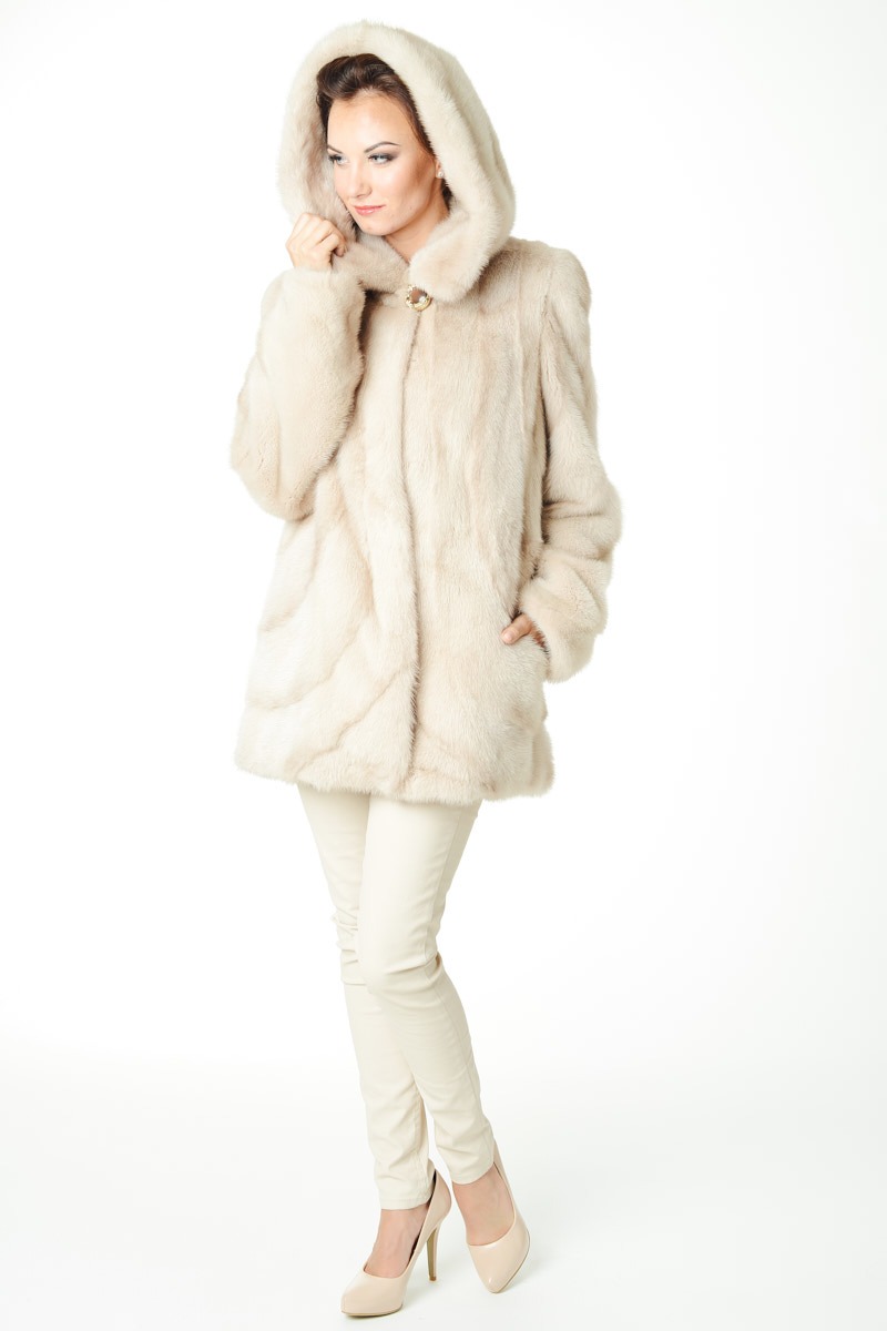Kurtkę uszyto z pełnych grzbietów norek, połączonych w wyrafinowany sposób z norkami epilowanymi. Uzyskany dzięki temu, niebanalny wzór, zachwyci nawet najbardziej wymagających. Na uwagę zasługuje również fason – prosty, który można dopasować w talii dzięki dyskretnemu ściągaczowi. Na chłodniejsze dni, doskonale posłuży mięciutki, lekki, głęboki kaptur.