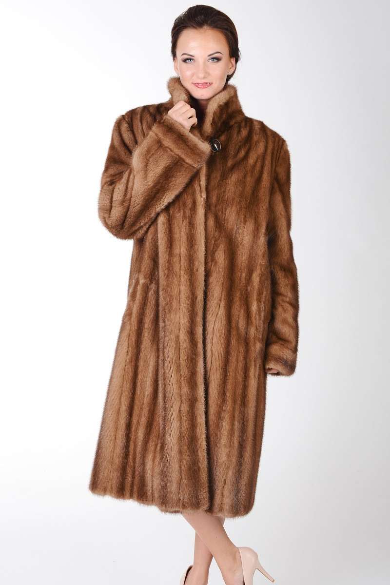 Jasnomiodowe futro z grzbietów wysuwanych norek o lekko rozkloszowanym fasonie to ekskluzywne okrycie na zimę, które nada każdej stylizacji luksusowego posmaku.